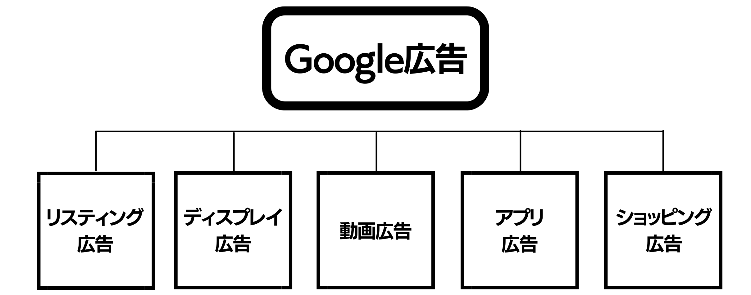 一言でGoogle広告と言っても、その中でいくつかの種類に分けることができます。下記の図は、Google広告における種類の大まかなイメージです。